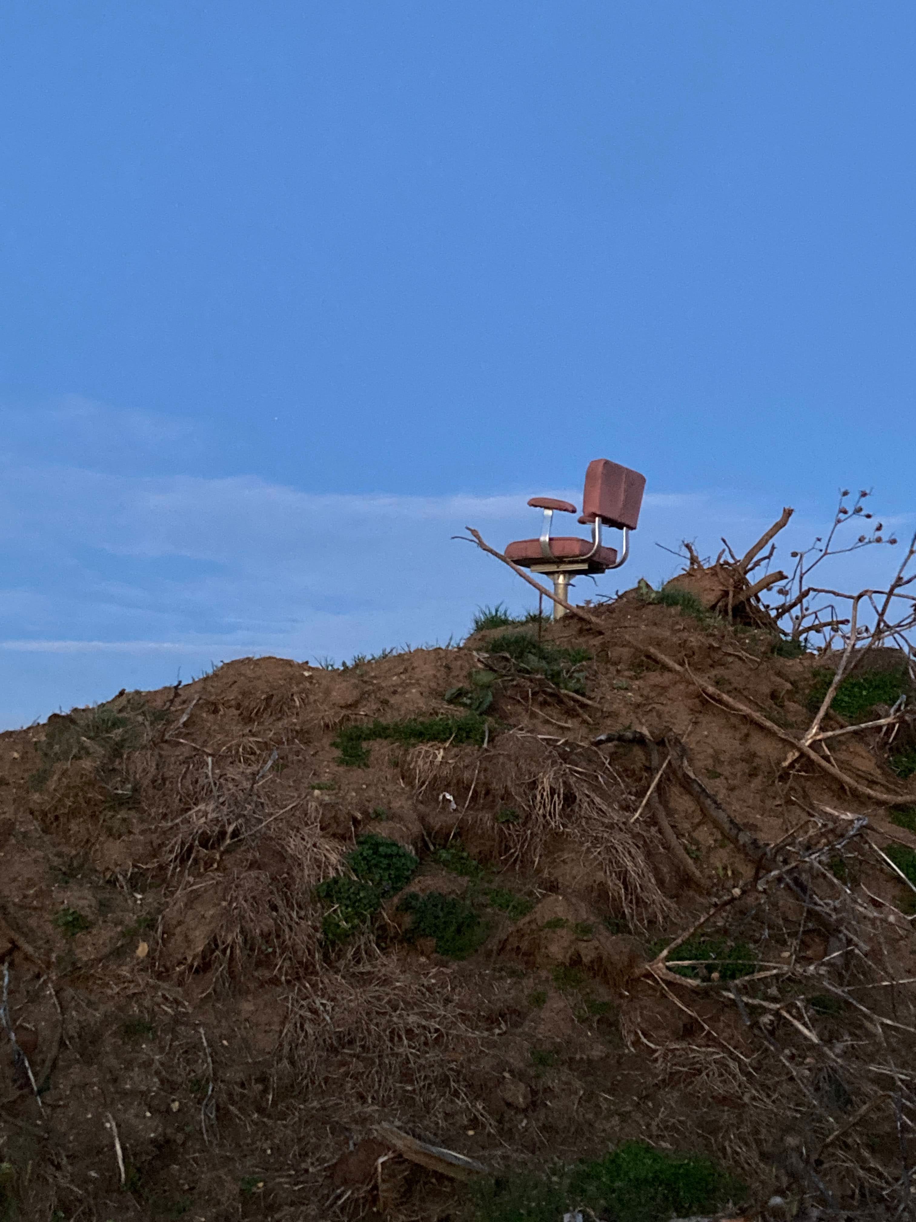 I find an enormous driftwood stump, at least two feet across and maybe fifty pounds, the grains wrapping over sea-tumbled curves in unevenly eroded, parallel rows. It already looks like a chair. I lug it haltingly across long stretches of sand back to the car