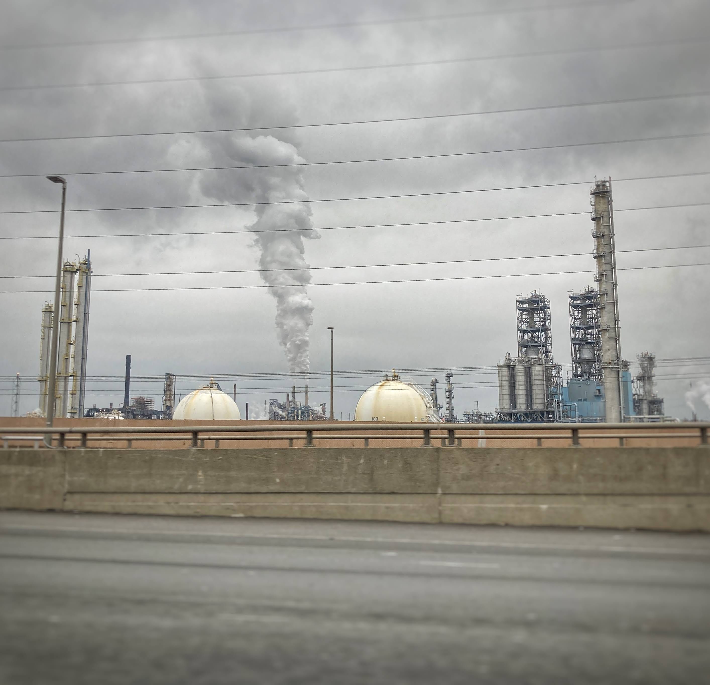 A seagull drifts across the misty, sputtering sky that smothers the New Jersey Turnpike this morning. I drive past my favorite spot, the painfully ugly and strangely beautiful jumble of oil tanks and refinery towers in Elizabeth, reputedly the cancer capital of New Jersey. This stretch always makes me think of Spingsteen’s wretched end to the ironic hymn, Born in the USA, narrated by a war veteran: